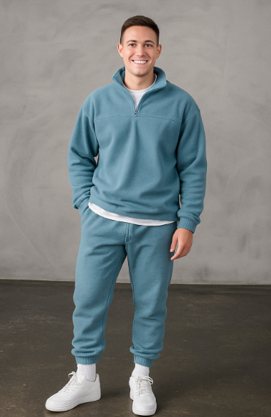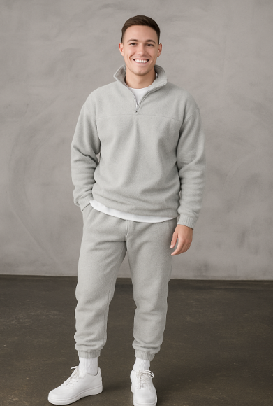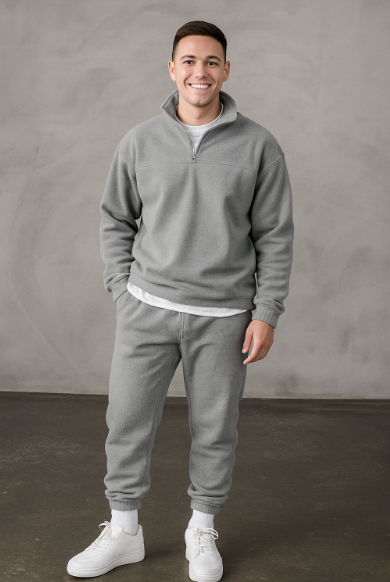 Dieser moderne Trainingsanzug ist ideal für Männer, die es bequem und gleichzeitig modisch mögen. Weiches Fleece-Material hält dich warm, während der halbe Reißverschluss für Belüftung und einfaches An- und Ausziehen sorgt. Ob unterwegs oder zu Hause – dieser Anzug passt immer. Die dezente Farbe macht das Styling einfach.